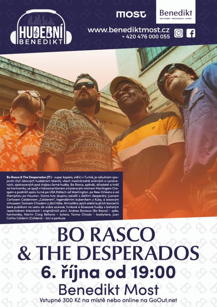 Tato super kapela, sídlící v Turíně, je výbušným spojením čtyř úžasných hudebních talentů, všech mezinárodně známých a uznávaných, sjednocených pod vlajkou černé hudby. Bo Rasco, zpěvák, skladatel a hráč na harmoniku, se spojil s Italoameričanem a kytarovým mistrem Martingem Craigem a podnikli spolu turné po USA Státech od Washington. po New Orleans a od Memphisu po Houston. Doma tuto skupinu založili s dalšími desperáty: Juanem Carlosem Calderinem „Calderem“, legendárním bubeníkem z Kuby, a basovým virtuosem Toninem Chiodem z jižní Itálie. Atmosféra jejich elektrizujících koncertů bere publikum na cestu do srdce soulové, funkové a bluesové hudby s bohatým repertoárem klasických i originálních písní. Andrea Borasco (Bo Rasco) – zpěv, harmonika, Martin Craig Bellavia – kytara, Tonino Chiodo – baskytara, Juan Carlos Calderin (Caldero) – bicí a perkuse. Vstupenky jsou k zakoupení na recepci Benedikt Most nebo na stránkách GoOut.net